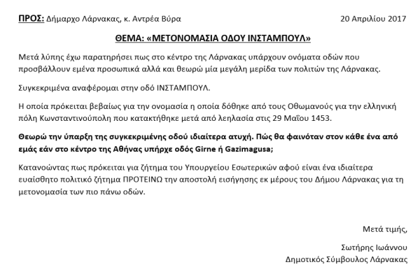 Με αφορμή την κίνηση του Σωματείου Aδούλωτη Κερύνεια να ζητήσει από το Δημοτικό Συμβούλιο Λάρνακας την μετονομασία της οδού Ινσταμπούλ στο κέντρο της πόλης, οφείλω να υπενθυμίσω το ιστορικό, καθώς και την πρόταση που είχα καταθέσει ως Δημοτικός Σύμβουλος της πόλης.